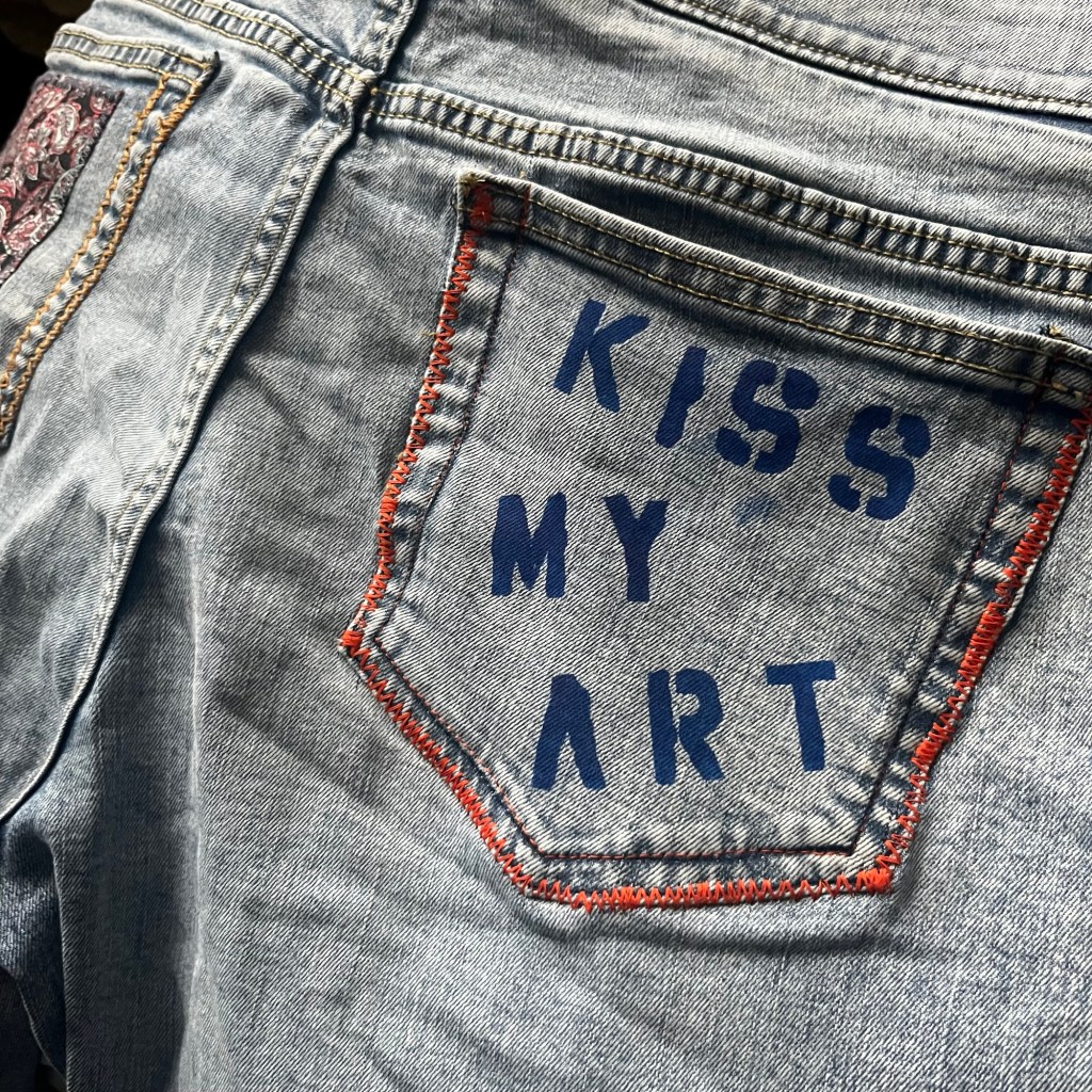 Stenciled pant pocket note.